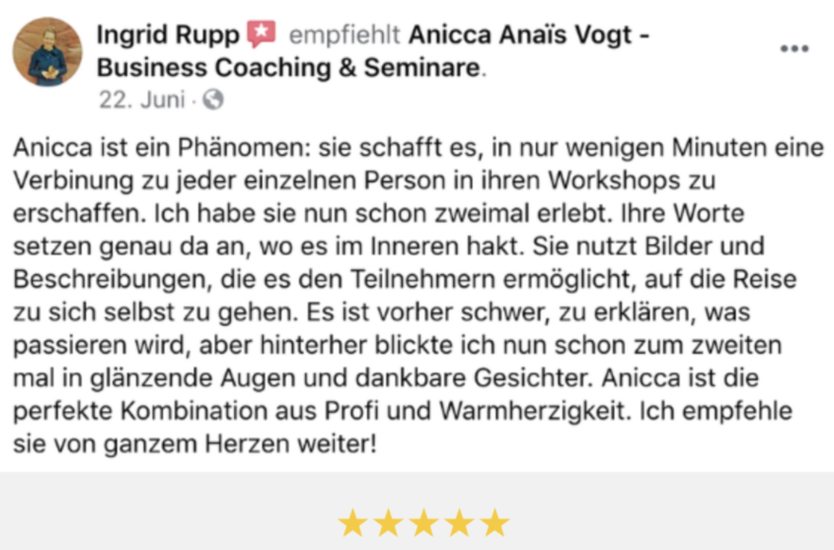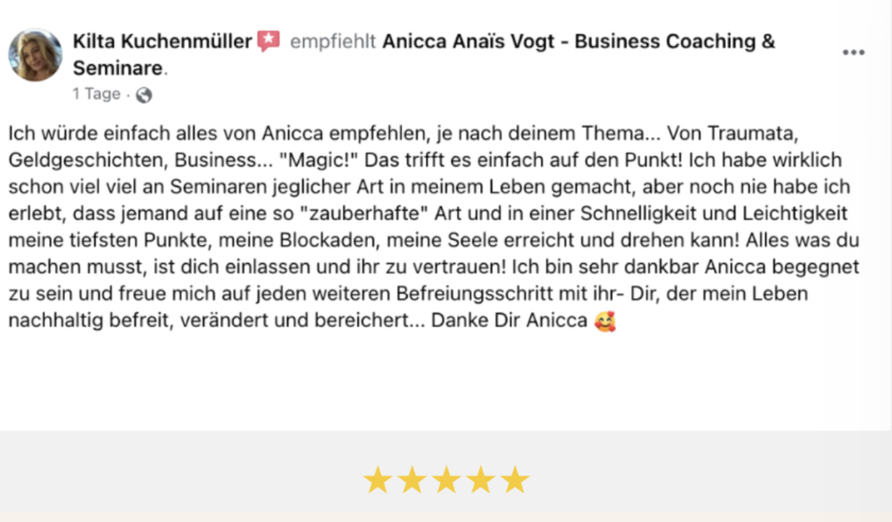 Ich habe zwei Online-Workshops und ein Coaching bei Anicca besucht. Schon nach dem ersten Workshop kamen in den doppelt so viele Anfragen herein wie sonst. Und auch jetzt, nach Monaten, bleibt meine Auslastung auf einem konstant hohen Niveau. Meine Haltung zu Geld hat sich komplett verändert, ich erlebe viel mehr Sicherheit, Zuversicht und Entspanntheit.